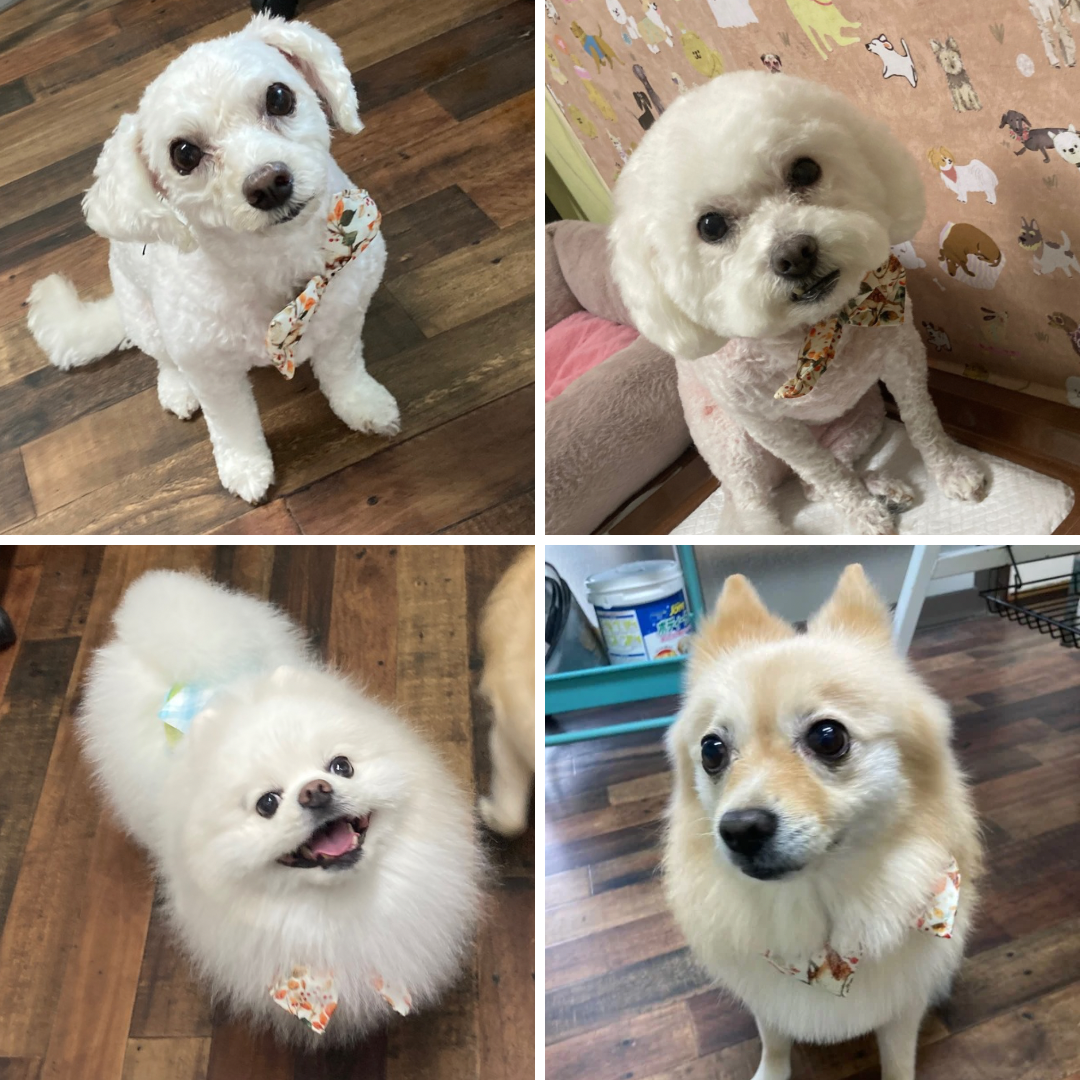 白ポメの男の子と茶ポメの女の子。同じお家の子たちです。冬バージョンで毛は長めにお尻周りはスッキリとカットしています。2匹とも懐っこくて、カメラを向けるとチャッとこちらを向いてくれるかわいい子たちです😊